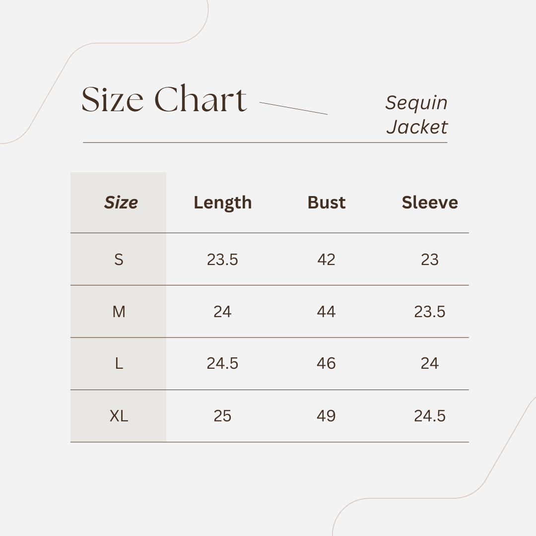 *Our sequin jackets are designed to shine — but they’re also delicate. If snagging occurs, gently untangle the thread to prevent sequins from coming loose or falling off. Handle with care and avoid rough surfaces to keep your jacket looking its best.